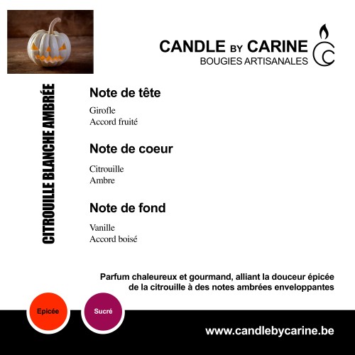 CITROUILLE BLANCHE AMBRÉ Prix 15,50 € PARFUM CITROUILLE BLANCHE AMBRÉE Bougie en verre opaque orange Simple mèche Contenant de 180 ml.