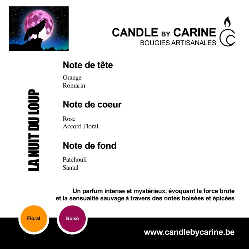 Rupture de stock LA NUIT DU LOUP Prix 15,50 € PARFUM LA NUIT DU LOUP Bougie en verre opaque orange Simple mèche Contenant de 180 ml.
